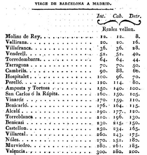 Es el caso que se establecieron unos itinerarios y paradas para el viaje en diligencia desde Madrid a Barcelona, pasando por Valencia y a la inversa. El precio, en reales de vellón, viene establecido para estos viajes y varía dependiendo del tipo de billete que comprásemos, pues uno podía ir cómodamente en el interior de la diligencia (eran los asientos más caros), en la zona de las caballerías (delante) o en la parte trasera del vehículo (detrás); estas últimas, claro, eran de precio más asequible, aunque menos confortable, como es de suponer.